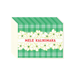 Mele Kallikimaka! Modern aloha meets traditional Hawaii with this palaka and floral print card that celebrates the Christmas season.