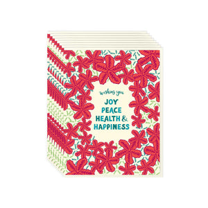 This holiday season, let's spread joy, peace, health, and happiness to all those who are dear to us, near and far. Retro-inspired hibiscus blooms surround this caring holiday sentiment.