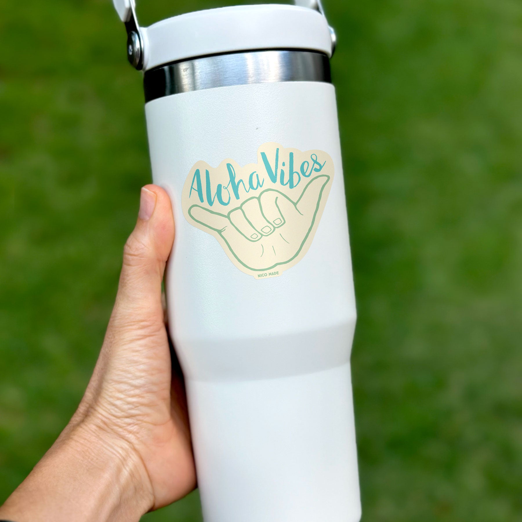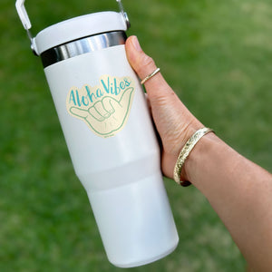 New Colorway! Our "Aloha Vibes" sticker brings good vibes and aloha wherever it goes, featuring hand-lettering and illustration by Nicole Ferrara. Stick it anywhere you want to add some aloha.